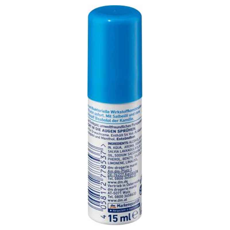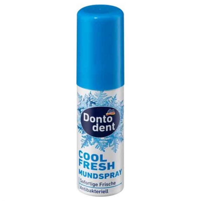 رذاذ الفم Dontodent Cool Fresh مع زيت المريمية والعنصر النشط بيسابولول من البابونج ينعش على الفور وله تأثير مضاد للبكتيريا. الوصفة نباتية. بدون غاز دافع مع نظام ضخ صديق للبيئة.