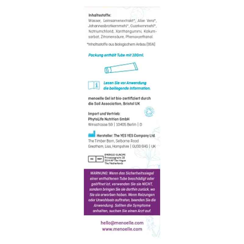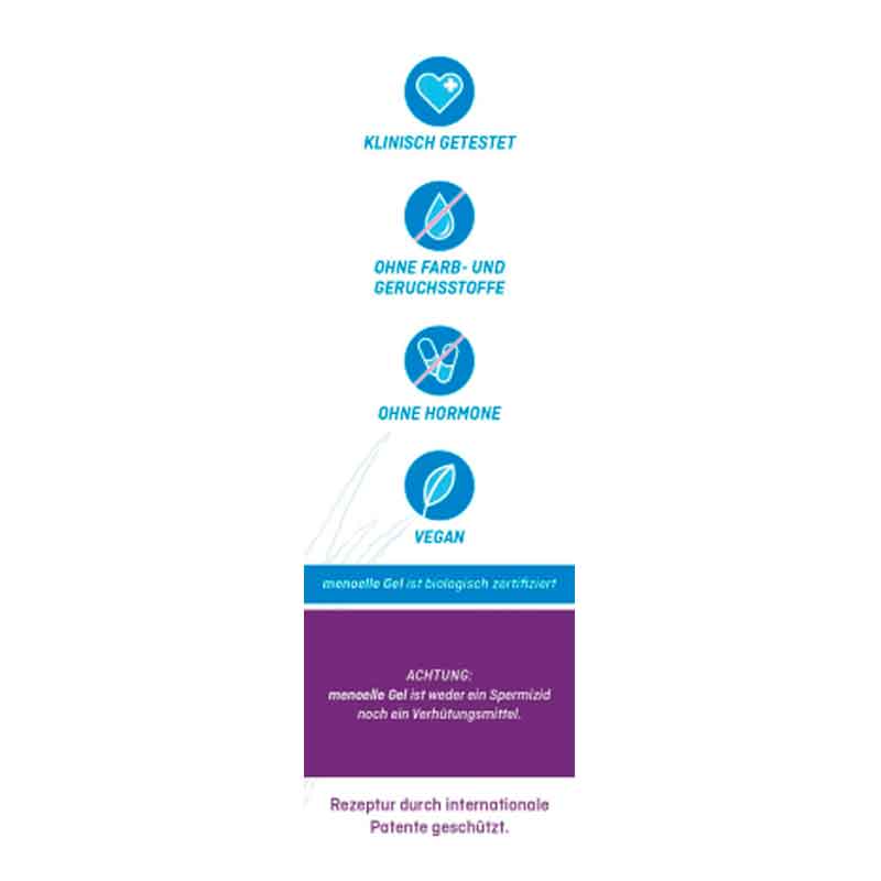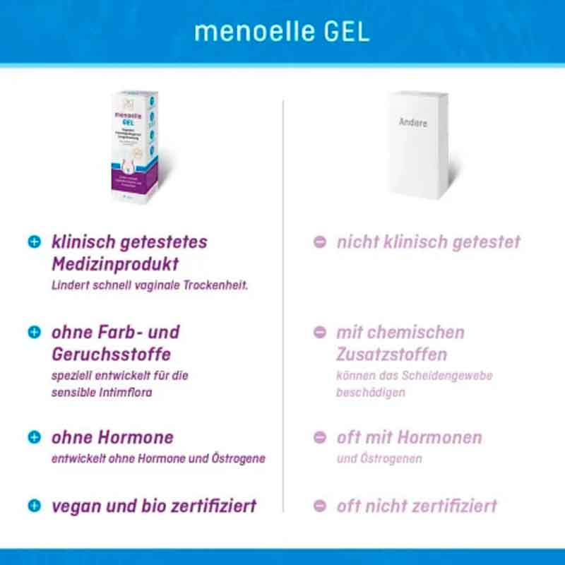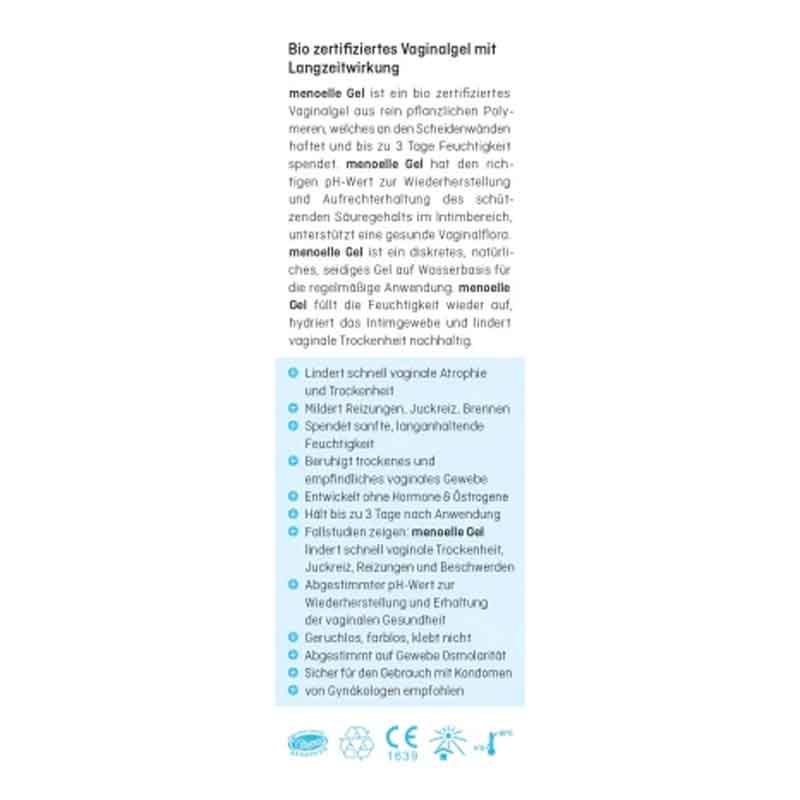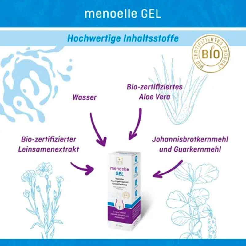 جل الترطيب المهبلي Menoelle هو جل ترطيب عضوي معتمد ذو أساس مائي لمنطقة المهبل. يستخدم Menoellel تقنية حاصلة على براءة اختراع ويوفر رطوبة طبيعية طويلة الأمد للغشاء المخاطي المهبلي الجاف. إذا كان هناك نقص في هرمون الاستروجين (على سبيل المثال أثناء انقطاع الطمث)، فإن الغشاء المخاطي المهبلي الجاف قد يسبب حكة أو حرقة أو تهيج. هنا يوفر الجل راحة فعالة وسريعة وطويلة الأمد ويضمن الرفاهية في المنطقة الحميمة.