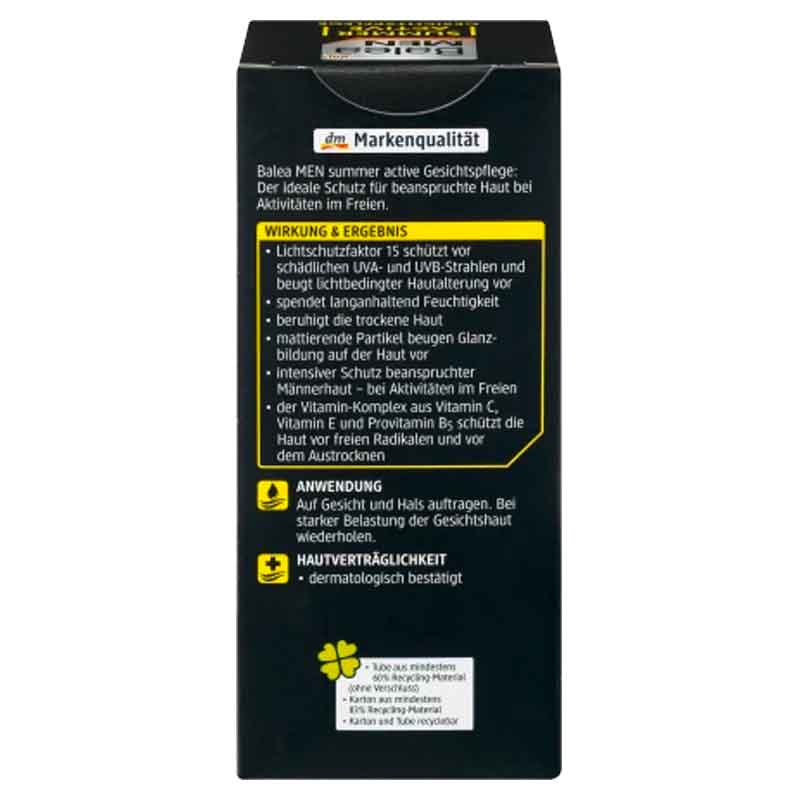 كريم النهار للعناية بالوجه Summer Active للرجال من Balea MEN هو الحماية المثالية للبشرة المجهدة أثناء الأنشطة الخارجية. مركب الفيتامينات المكون من فيتامين C وفيتامين E وبروفيتامين B5 يحمي البشرة من الجذور الحرة والجفاف. كما أنه يوفر رطوبة طويلة الأمد.