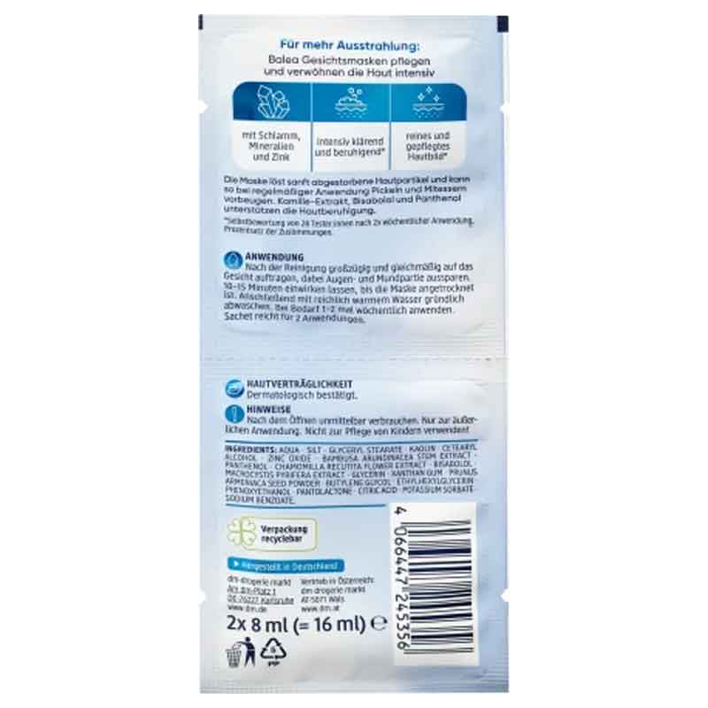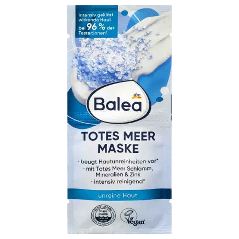 قناع البحر الميت من Balea غني بالطين والمعادن والزنك. يتمتع القناع بتأثير منقي ومهدئ مكثف*، ويزيل بلطف جزيئات الجلد الميتة ويمكن أن يمنع ظهور البثور والرؤوس السوداء عند استخدامه بانتظام. مستخلص البابونج والبيسابولول والبانثينول يدعمان تهدئة البشرة. وصفة خالية من المواد البلاستيكية الدقيقة والبوليمرات الاصطناعية البحتة القابلة للذوبان في الماء.