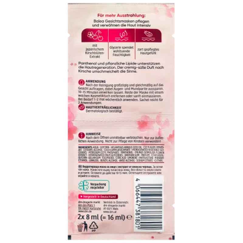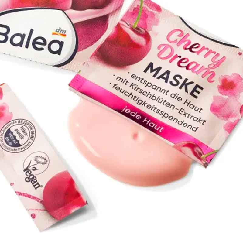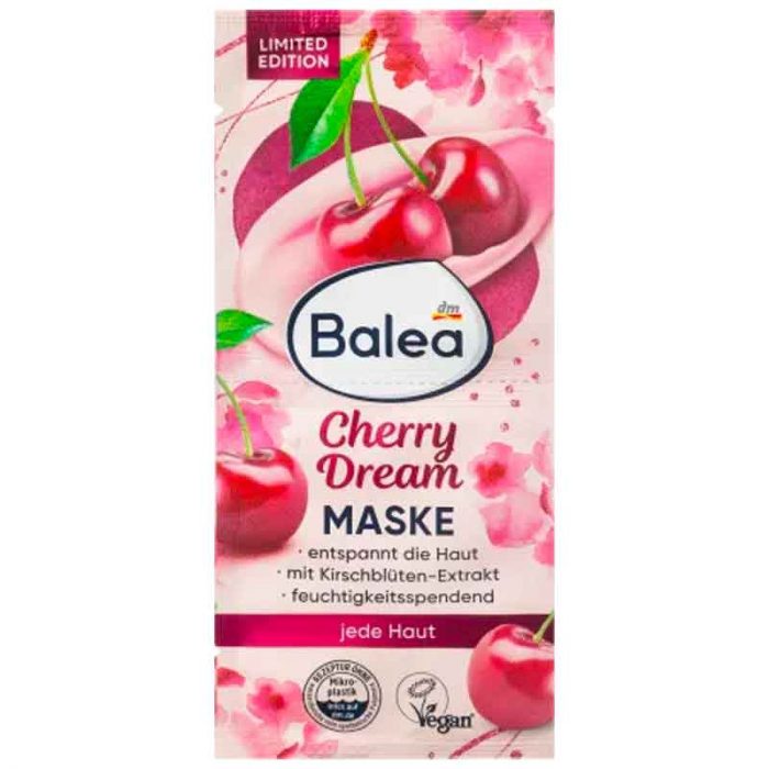 يوفر قناع Balea Cherry Dream مع مستخلص زهر الكرز الياباني للبشرة رطوبة مهدئة ويترك البشرة تشعر بالعناية الدقيقة. يحتوي البانثينول والدهون النباتية على تجديد الجلد. رائحة الكرز الكريمية الحلوة تداعب الحواس. وصفة خالية من المواد البلاستيكية الدقيقة والبوليمرات الاصطناعية البحتة القابلة للذوبان في الماء.