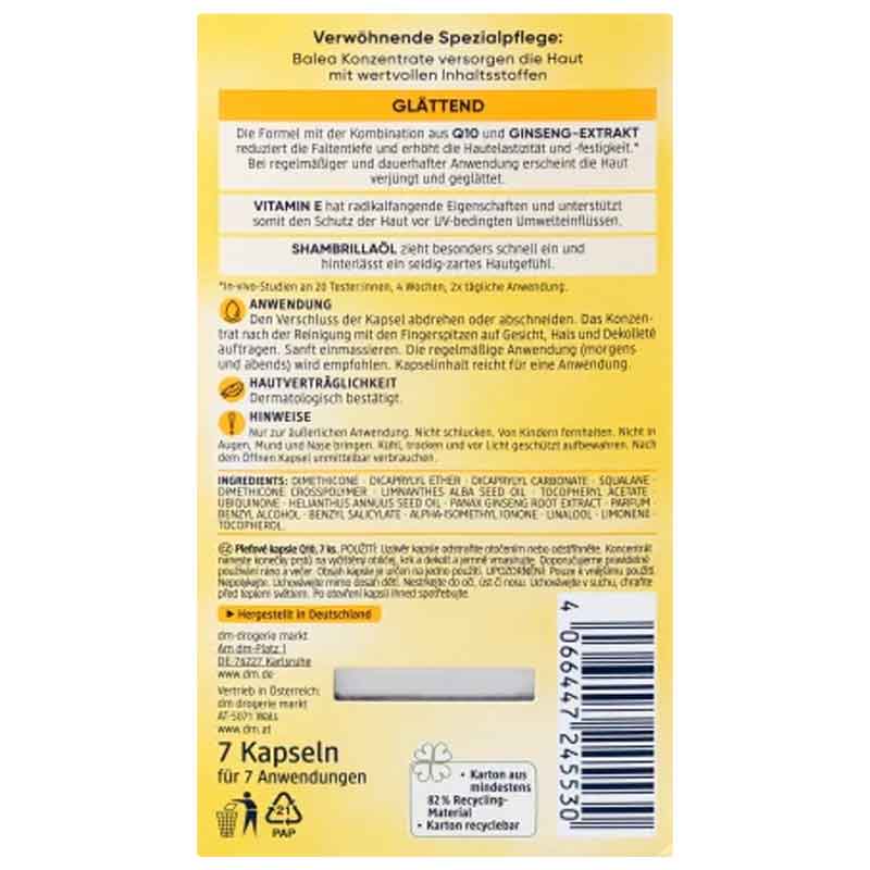 تدليل العناية الخاصة بفعالية نشطة: يقلل مركز Balea Q10 المضاد للتجاعيد مع Q10 ومستخلص الجينسنغ من عمق التجاعيد ويزيد من مرونة الجلد وثبات الجلد.* يبدو الجلد أكثر نعومة وأصغر سنًا مع الاستخدام المنتظم وطويل الأمد. يتمتع فيتامين E بخصائص محاصرة الجذور وبالتالي يدعم حماية الجلد من التأثيرات البيئية المرتبطة بالأشعة فوق البنفسجية. يتم امتصاص زيت شامبريلا أيضًا بسرعة خاصة ويترك البشرة ناعمة وحريرية.