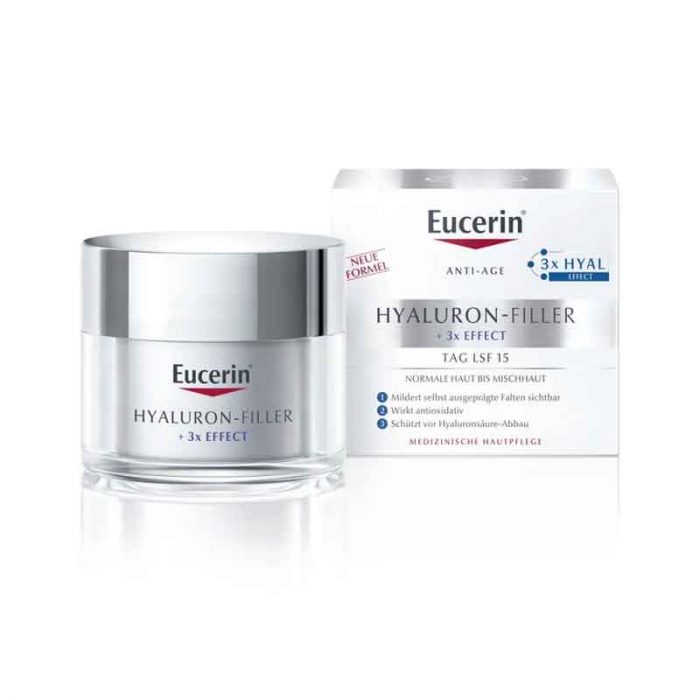 Eucerin Hyaluron-Filler + 3x Effect Day Care هو كريم نهاري يحتوي على حمض الهيالورونيك للبشرة العادية إلى المختلطة – تم تطوير الرعاية المبتكرة المضادة للشيخوخة خصيصًا لهذا النوع من البشرة. فهو يجمع بين حمض الهيالورونيك طويل السلسلة مع جزيئات حمض الهيالورونيك القصيرة السلسلة الأصغر بـ 40 مرة. كريم النهار يقلل بشكل واضح من التجاعيد الواضحة من الداخل إلى الخارج. يدعم السابونين الذي يحتوي عليه إنتاج الجلد لحمض الهيالورونيك الذي يملأ التجاعيد.