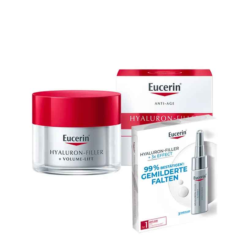 كريم النهار ضد التجاعيد وفقدان الحجم Eucerin Hyaluron-Filler + Volume-Lift Day Care للبشرة العادية إلى المختلطة يقاوم فقدان الحجم والكفاف وكذلك التجاعيد بثلاثة مكونات نشطة. مع حمض الهيالورونيك كمكون، يقلل كريم النهار المضاد للشيخوخة من عمق التجاعيد ويمنح البشرة رطوبة مكثفة. بالإضافة إلى ذلك، يضمن الماجنولول والأوليجوببتيدات مظهرًا مشدودًا وممتلئًا للبشرة من خلال زيادة كمية خلايا الجلد المتضخمة وتحفيز إنتاج الكولاجين (دراسة في المختبر). من أجل منع شيخوخة الجلد المرتبطة بالشمس والضوء وتعميق التجاعيد، تحتوي العناية النهارية Hyaluron filler + Volume Lift على عامل حماية من الشمس SPF 15 ونظام تصفية UVA. تم تطوير الكريم خصيصًا لتلبية احتياجات البشرة العادية إلى المختلطة.