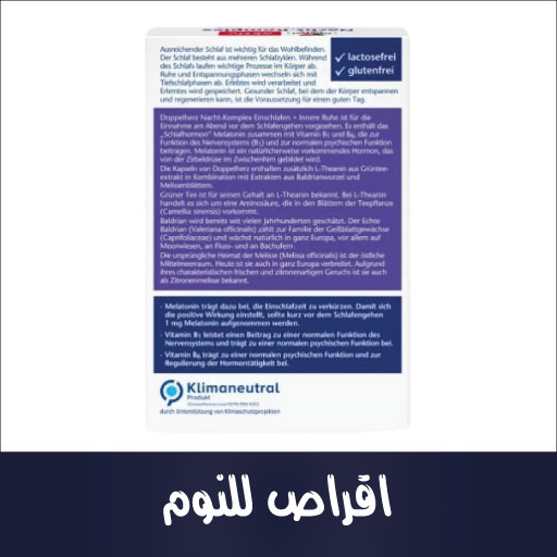 كبسولات المركب الليلي من Doppelherz غنية بالميلاتونين وحشيشة الهر وL-theanine. يمكن أن يؤثر الميلاتونين على الوقت الذي يستغرقه النوم. ولكي يحدث التأثير الإيجابي، ينبغي تناول 1 ملغ من الميلاتونين قبل وقت قصير من النوم.